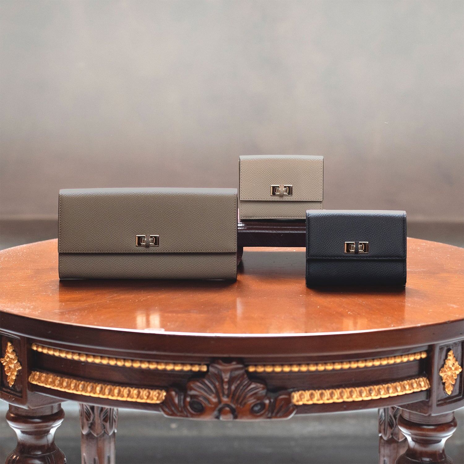 特集ページは こちら商品詳細ヨーロッパ最高級「ノービレレザー」を贅沢に使用したコンパクトウォレット上質なノービレレザーを使用した、ミニマルで洗練されたコンパクトウォレット。日常に特別感を添える佇まいが魅力です。滑らかなレザーと金具の調和が生む上質感しっとりとした質感のレザーに、控えめながらも印象的な金具がマッチし、エレガントな雰囲気を演出します。イタリア職人の技が息づくクロージャーメタルサイズに合わせた丁寧なカッティングと仕上げが光るクロージャー。細部まで行き届いた職人技が唯一無二の存在感を放ちます。バイカラーのインサイド(※エトープは同色)で、さりげない遊び心を演出ちらりと見える内側のバイカラーが、持つたびに心をくすぐるアクセントに。シンプルな外観とのコントラストが、上品な個性を引き立てます。コンパクトながら高い収納力を実現小ぶりなサイズ感でありながら、お札?カード?コインをそれぞれ分けて収納できる実用的な設計。カードスロット付きで整理整頓もスムーズ内側にはカード10枚まで収納可能なスロットを完備。お財布の中がすっきり整います。中央部にあるお札収納で使いやすさも抜群お札は三つ折りで中央スペースに収納可能。取り出しやすさにも配慮されています。前面にジッパー付きコインポケットを配置コイン収納部はジッパー式で、しっかり閉じられて安心。ミニバッグでのお出かけにも最適な設計です。